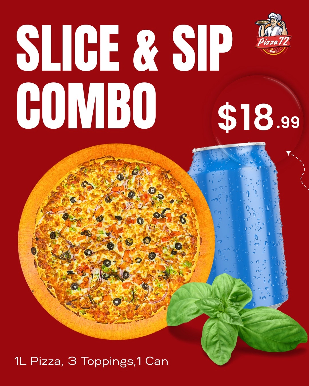 Treat yourself to the perfect combo — a Large 1-topping pizza, your choice of 3 toppings, and 1 refreshing can of pop — all for just $18.99.